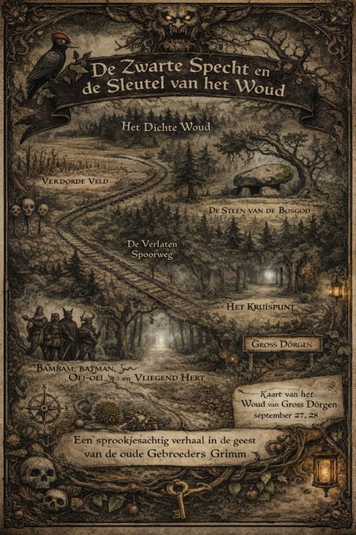 Die zaterdagochtend verlieten vier mannen Groß Dörgen voor een verre expeditie. Naar een oude steen bij het megalietgraf. In de steen zat iets gevangen. De Springwortel was de Stenen Sleutel om het te bevrijden. Niemand anders dan Bambam, sterk als een eik, Batman, scherp van geest, Oei-oei, die altijd het gevaar als eerste voelde en Vliegend Hert, die de taal van het  bos leek te begrijpen, konden het uit de steen bevrijden. De troep had alleen geen idee waaraan ze waren begonnen. Eén ding was zeker, de legende van het megalietgraf was niet zomaar een oud volksgeloof. In de steen zat iets verborgen, het was geen baby. (Het bleek inderdaad iets anders, had de troep dit geweten, waren ze direct teruggekeerd) Alleen het geheime kruid van de Zwarte Specht gaf toegang tot de steen. Na een tijd kwam de troep aan bij het naaldbos. De eens zo donkere bos stond er verlaten bij. Wat was hier gebeurd? De bomen hadden ongewenst bezoek gehad, ze hadden bezit genomen van de sappen onder hun schors. De stammen leken verstild in hun laatste schreeuw. Het gezelschap trok verder over de eindeloze weg. Eindelijk bereikte de troep het bordje met de naam Dörgen. De rand, hier eindigde het veilige woud van Groß Dörgen. Hierna werd het bekende onbekend, veranderde de wereld om hen heen. Het viertal naderde het Kruispunt. Aan de overzijde lag de Verlaten Spoorweg. De roestbruine rails lagen als stille getuigen in het dorre veld. Ooit dragers van gillend gefluit, stoom en vuur, nu zwijgend wijzend naar het verre oosten. Niemand wist waar de spoorweg ooit heen had geleid. De wind stierf weg. Witte Wieven kropen als mist over de grond. ‘Het bos kijkt naar ons,’ zei Oei-oei zacht. Vliegend Hert knikte. Het was niet alleen het bos. Niemand zag de figuur die hen volgde. De troep kwamen uit bij een groot leeg veld. Het Verdorde Veld, het stille portaal van het Dörgener Moor. Het moeras was donker, zompig en verlaten, hier werd gestreden om het licht. De verliezers zonken langzaam weg in de zwarte krochten van het Moor. Op de hoek van het pad lag een grote mierenhoop. Het volk van de mieren bereidde zich voor op de lange winter die zou komen. Bambam wees verschrikt naar het gekrioel op de mierenhoop. Duizenden mieren leken in de dennennaalden langzaam een figuur te vormen. Een vinger. Die wees dreigend naar Groß Dörgen. Een laatste waarschuwing terug te keren naar het veilige woud. Plots hoorde de troep een geluid. TOK TOK TOK. Een Zwarte Specht roffelde op een boom. Maar het geluid klonk niet als een vogel. Het klonk als een allerlaatste waarschuwing. Batman draaide zich om. Even dacht hij een man tussen de bomen te zien. Opnieuw veranderde de wereld om hen heen. De rechte weg verdween, het bos werd stil, de bomen stonden dichter bij elkaar dan normaal. Overal groeiden ineens kastanjebomen. Hoe verder zij liepen, hoe vreemder het bos werd. De Verte leek de horizon met zijn blauwe hoed te dragen. Kastanjebomen bewogen zich langzaam in een rij langs het pad alsof ze wachters waren. ‘Zij wijzen ons de weg,’ zei Vliegend Hert. ‘Of waarschuwen ons’, mompelde Oei-oei. Niemand wist waarom hij dat zei. Maar het bleek waar. Soms klonk ergens diep in het bos het roffelen van de specht. Oei-oei keek om zich heen. ‘Het lijkt alsof iemand ons volgt.’ Vliegend Hert bleef staan, hij keek om zich heen. Ze zagen niets, toch zagen ze voetsporen zachtjes in het zand drukken. Ergens achter hen klonk opnieuw het geluid van een specht. TOK TOK TOK. Nu was het anders. Harder. Alsof iemand op een deur klopte. Na een lange tocht bereikte de troep eindelijk de eindbestemming. Het Dichte Woud van Apeldorn. Tussen het bronsgroene gebladerte verscheen een heuvel. Midden op de heuvel stond een grote hunebed. Het was het eeuwenoude megalietgraf. Opgelucht dat ze het doel hadden bereikt, werd bij het graf een foto van de troep gemaakt. Batman keek naar rechts en fluisterde: ‘Dat moet de steen zijn’. Hij knikte naar de rand van het bos. Daar lag de reusachtige steen. Ouder dan de dorpen, groot en zwaar. Mos als een baard bedekte de randen, boomwortels klauwden over de steen als oude vingers. Langzaam liep de troep naar de steen. Bambam haalde de Springwortel tevoorschijn. Op dat moment sprong iemand uit de struiken. De troep kende hem. Het was een bekende maar vervelend figuur. Hij viel mensen lastig omdat hij vond dat het bos van hem was. Het was stroper Schnoeing. Hij was de schaduw die de troep had gevolgd. Schnoeing richtte zijn geweer. ‘Geef mij het kruid’, zei hij. ‘Het hoort jullie niet toe’. Oei-oei was sneller, hij pakte het kruid en gooide het naar de steen. Toen het tegen de steen viel, gebeurde er iets wonderlijks. De steen kraakte. De aarde zuchtte. Langzaam schoof de steen open. Een koude wind stroomde naar buiten. Uit de duisternis klonk een stem. De stroper lachte. ‘Eindelijk.. de kracht van het bos!’. ‘Maar de stem antwoordde: ‘Niet voor jou’. Een kleine man, lange rug, korte benen, stapte naar buiten. Zijn haar was mos, zijn baard gras, zijn wenkbrauwen zo groen als jonge bladeren. Zijn ogen glinsterden als smaragden. Bladeren groeiden overal uit zijn kleding. Het was de Groene Man, een oude bosgod. Hij keek eerst naar de stroper. Toen naar de vier mannen. Hij sprak: ‘Lang geleden sloten mensen mij op, ze wilden het geheim van het bos stelen’. De Groene Man deed een stap naar hen toe. ‘Waarom hebben jullie mij bevrijd?’ Het leek de troep wijzer hierop geen antwoord te geven. De bosgod aanschouwde hen. Hij kon ze vervloeken om het geheim van het woud niet te schenden. Alleen goede antwoorden op vier vragen konden hen redden. De eerste vraag ging naar Bambam. ‘Wat is het grootste geheim van het bos?’ Bambam dacht lang na. Toen zei hij: ‘Dat het leeft, zelfs wanneer wij het niet zien.’ De Groene Man knikte. De tweede vraag ging naar Batman. ‘Wat neemt een mens uit het bos?’ Batman antwoordde: ‘Hout, voedsel, warmte’. ‘Maar hij moet ook iets teruggeven’. De Gro
